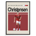 Christensen fodbold plakat i rød Danmark landsholdstrøje nummer 6 med bold foran sig i minimalistisk rød baggrund.