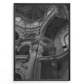 Fashion Plakat | Baroque Church Interior – Architectural Black and White Photography Plakaty.dk | Black and white photograph of a grand Baroque church interior with ornate columns, decorative arches, and ceiling frescoes