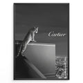Ladda upp bild till gallerivisning, Fashion Plakat | Cartier Panther Over the City: Iconic Elegance in Monochrome Plakaty.dk | Black and white image of a panther perched on a Cartier box overlooking a city skyline at night, with the Cartier logo in the sky.