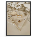 Ladda upp bild till gallerivisning, Fashion Plakat | Chanel No. 5 Perfume Flat Lay with Watch and Books – Neutral Aesthetic Print Plakaty.dk | Flat lay of Chanel No. 5 perfume bottle, gold watch, ring, and decorative shell on fashion books with soft floral blur in neutral tones.