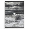 Fashion Plakat | Chanel Ocean Wave Black & White Fashion Poster Plakaty.dk | Black and white ocean wave poster with the Chanel logo centered over crashing waves and a stormy sky.