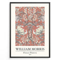 Framed William Morris Flower Pattern 1874 art print plakat with large cream flowers and vines on a terracotta background.