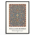 Framed William Morris Holland Park Carpet 1883 art print plakat with detailed blue, red, and gold floral carpet design.