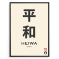 Japanske plakater | Minimalist Japanese Kanji wall art print featuring the characters with the English word "Heiwa" and its translation "peace" underneath.