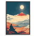 Ladda upp bild till gallerivisning, Japanske plakater | Japanese art print of a meditating person facing Mount Fuji under a full moon, surrounded by waves, clouds, and warm red-orange landscapes, framed in black.