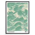 Japanese wave-pattern poster with flowing green lines on a beige background, titled “Yasuragi,” framed in a black border.