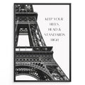 Fashion Plakat | Keep Your Standards High – Eiffel Tower Fashion Quote Wall Art Plakaty.dk | Black and white Eiffel Tower with quote "Keep your heels, head & standards high" on the right side.