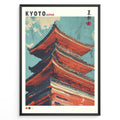 Japanske plakater | Illustrated close-up of a traditional red pagoda in Kyoto, Japan, set against a blue sky with stylized clouds.