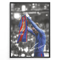 Plakat of Lionel Messi holding his Barcelona shirt after scoring against Real Madrid, with printed signature and black-and-white background.