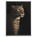 Fashion Plakat | Majestic Leopard in Shadow and Light Plakaty.dk | Portrait of a leopard in dramatic lighting, with half its face and body illuminated while the rest fades into shadow.