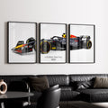 Ladda upp bild till gallerivisning, Triptych wall art plakat of the Red Bull Racing RB20 Formula 1 car displayed in a contemporary living room with a black leather sofa and modern furnishings.