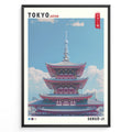 Ladda upp bild till gallerivisning, Japanske plakater | Illustration of Sensō-ji Temple’s red pagoda in Tokyo with a clear blue sky and Tokyo Skytree in the background, combining traditional architecture with a modern skyline.