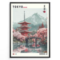 Ladda upp bild till gallerivisning, Japanske plakater | Illustration of the Senso-ji Temple in Tokyo, Japan, featuring a red pagoda, pink cherry blossom trees, a wooden bridge over water, and a mountain in the background, framed as a decorative travel poster.