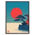 Japanske plakater | Poster of a Japanese temple with a bonsai tree and a person sitting near the water, with a large red sun setting against a blue-green sky.
