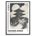 Ladda upp bild till gallerivisning, Japanske plakater | Black and white illustration of Yasaka Jinja’s five-story pagoda in Kyoto, Japan, with a full moon in the background and clouds surrounding the temple.