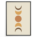 Framed boho moon phases art poster featuring crescent and full moon shapes in brown and orange tones on a beige background.