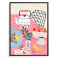 Colorful breakfast table illustration with kettle, fruit, and coffee—modern kitchen wall art print.