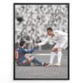 Cristiano Ronaldo og Lionel Messi fodbold plakat fra El Clásico hvor Ronaldo hjælper Messi op i Real Madrid og Barcelona trøje.