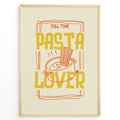 Fun kitchen art print plakat with the phrase “Full Time Pasta Lover” and a steaming pot of pasta in orange and yellow colors framed in black.