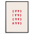 Minimalist wall art print plakat with the red quote “Good Food Good Mood” in heart-shaped typography framed in black on beige background.